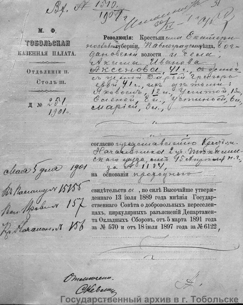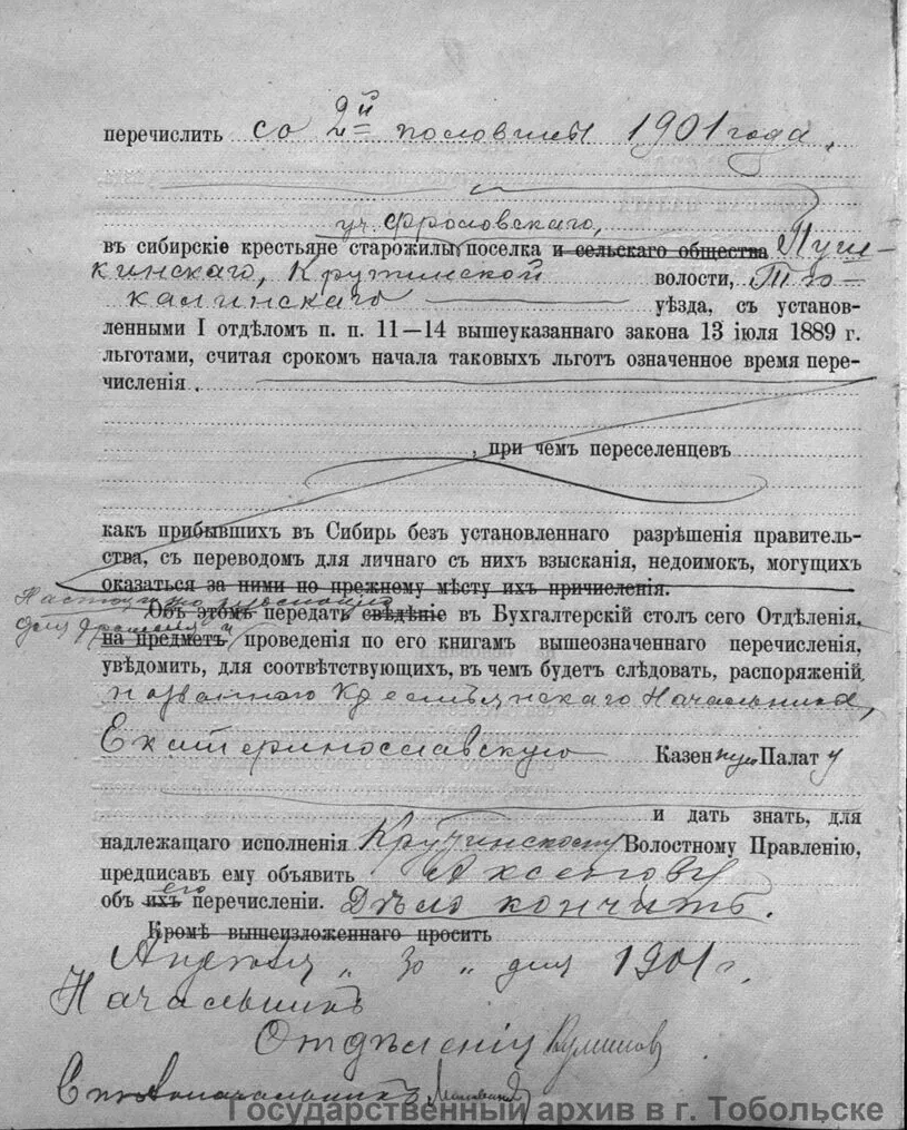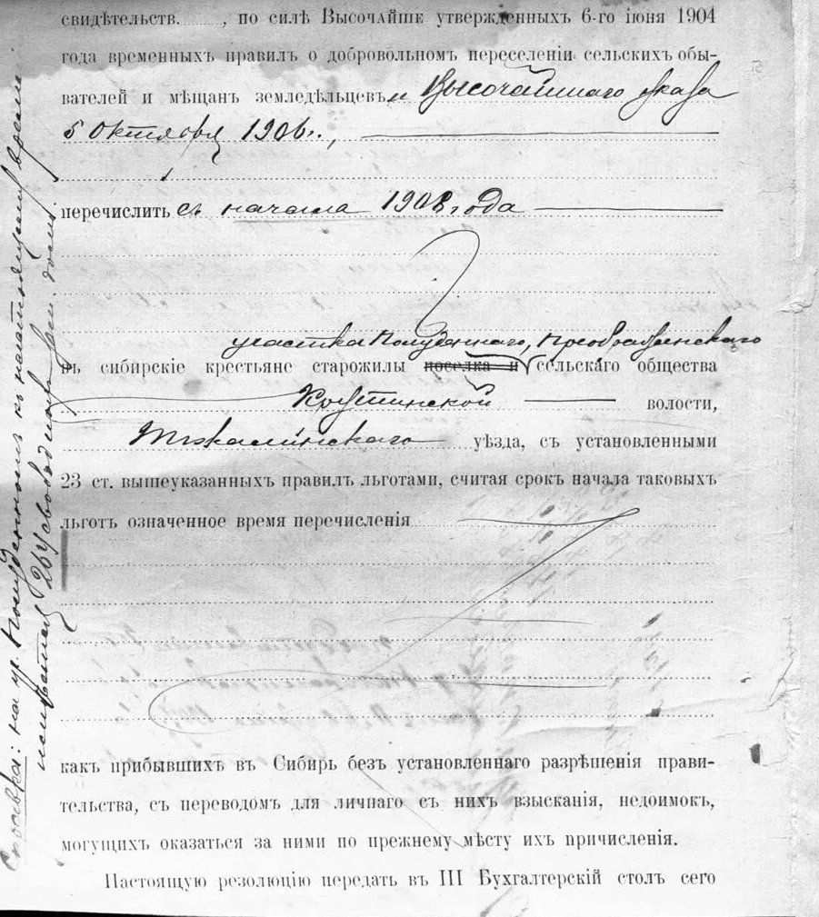 В мае 1907 года вслед за ними уехал и Федор Ильич с родителями и братьями Иваном 1901 г.р., Андреем 1905 г.р., сестрами Марией 1890 г.р., Степанидой 1892 г.р., Ксенией 1906 г.р. Добрались до нового места жительства лишь на следующий год в апреле 1908 года. Это был поселок Преображенский (разговорное Полуденное) Тобольской губернии Тюкалинского уезда Крутинской волости. Ранее уехавшая семья Чашкина Петра осела в соседнем поселке Пушкинский (разговорное Журавли).