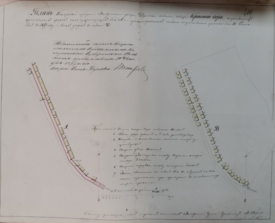Ниже План сельца Красный Бор составленный и утвержденный 20 декабря 1877 года. План составлен с целью строительства новых домов (левая часть плана). Запланировано строительство двухклассной школы. Новые дома в будущем получила название Заречье. На время составления плана расширения существовало 43 двора.