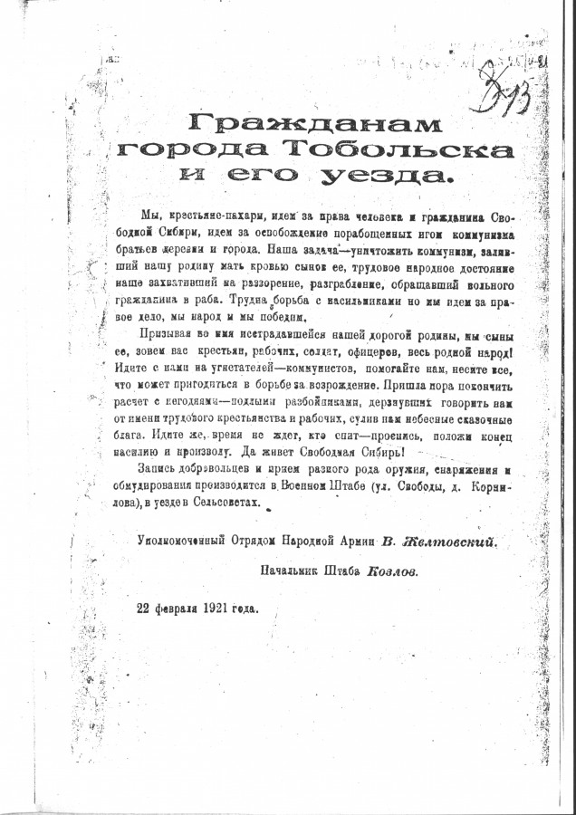 В начале февраля 1921 года произошел стихийный взрыв одновременно в нескольких уездах Тобольской губернии, а также в Тюкалинском и Тарском уездах Омской губернии, приобретший вскоре форму вооруженного восстания. В селах создавались отряды Народной армии, в которую, кстати, вступали все категории крестьян: и кулаки, и середняки, и бедняки. Восставшие провели мобилизацию мужчин в возрасте от 18 до 50 лет. Было сформировано несколько дивизий, входивших в четыре «фронта» во главе с главкомом поручиком В.А. Родиным. В ходе восстания повстанцы захватили почти все большие города Сибири. В занятых городах повстанцы создавали «городские крестьянские Советы». В Тобольске, находившемся под властью восставших с 20 февраля по 8 апреля, восставшие образовали «Тобольскую федерацию», издавали газету «Голос Народной армии». Численность повстанцев превышала 100 тысяч человек. Основным оружием повстанцев стали пики, дробовики, вилы и палки.
